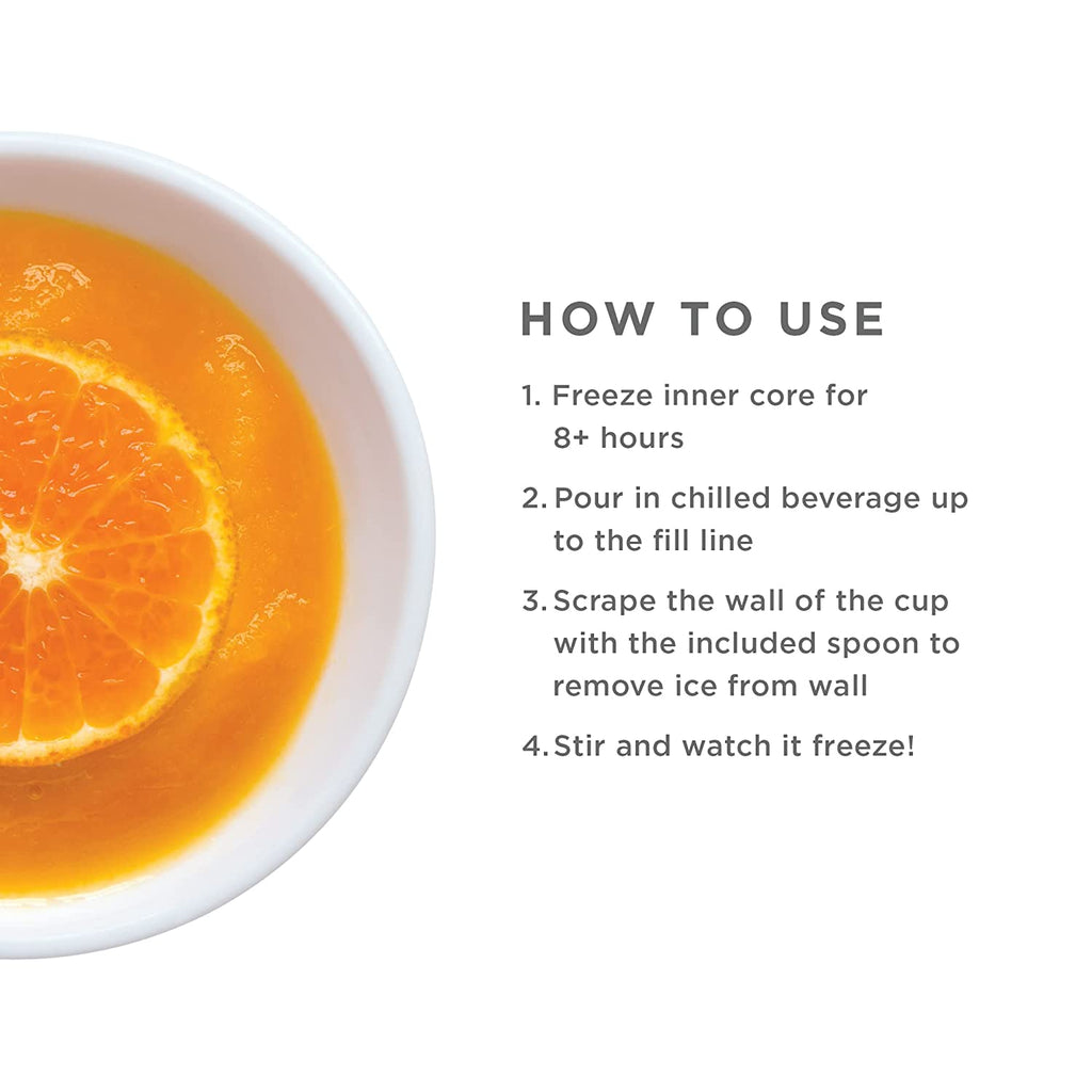 • EASY TO USE: Freeze the inner core for 8+ hours, remove from freezer and place it in to the outer cup, pour in your ingredients, mix and scrape the cup with the included spoon, watch as the slush freezes before your eyes; hand wash with warm water.
